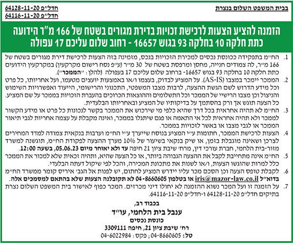 הזמנה להציע הצעות לרכישת זכויות בדירת מגורים בעפולה